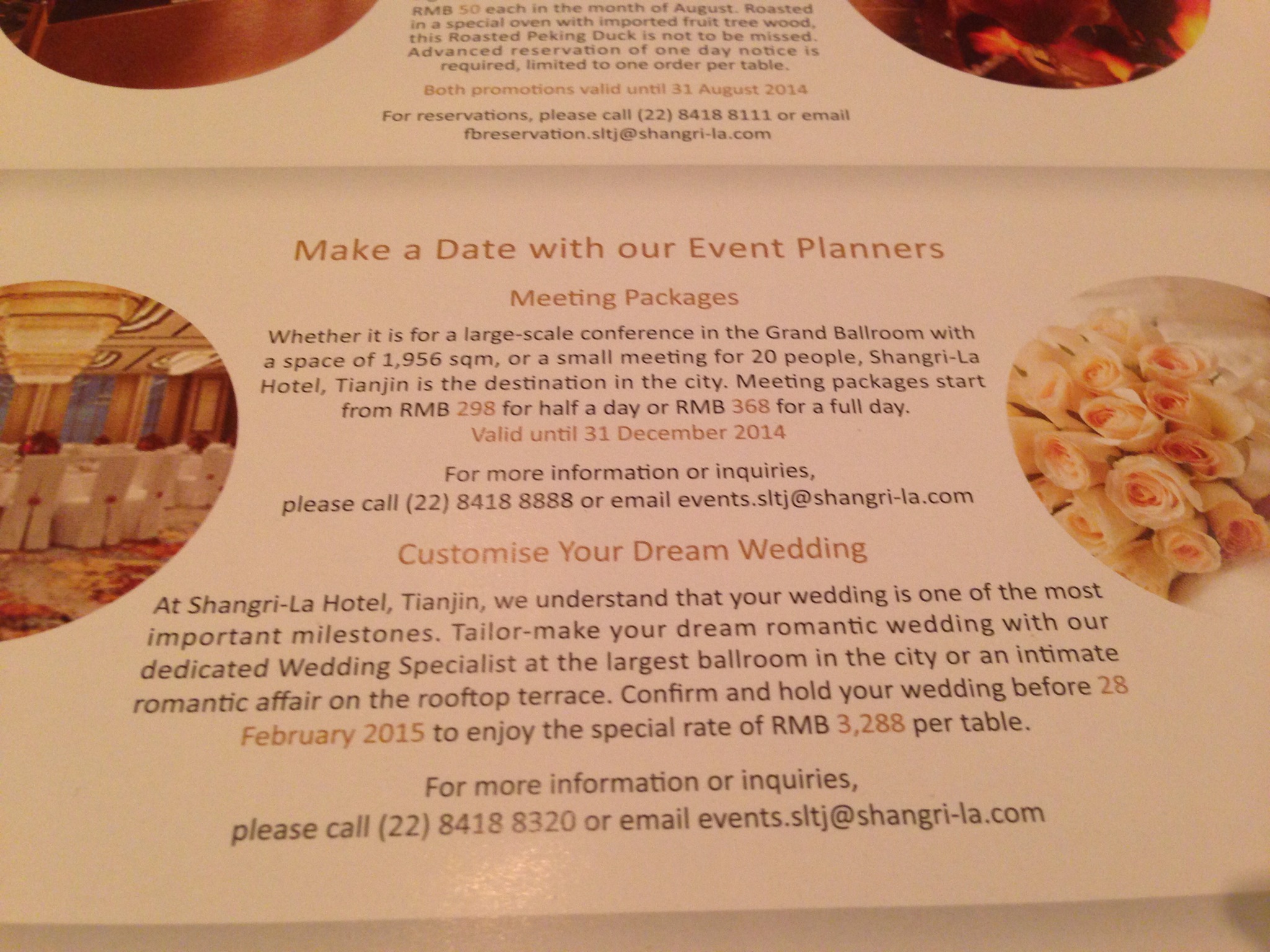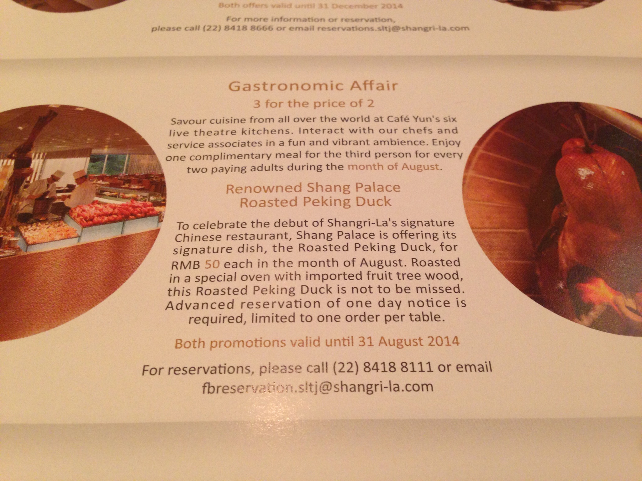 Uncategorized Amazing promotions at the new Shangri-La Tianjin August 16, 2014by turners0730 We just enjoyed a delicious Peking duck for 50 RMB! Offer on until the end of the month. -Mr & Mrs T Share this: Click to share on Facebook (Opens in new window) Facebook Click to share on X (Opens in new window) X More Click to email a link to a friend (Opens in new window) Email Click to share on Pinterest (Opens in new window) Pinterest Click to print (Opens in new window) Print Like Loading...